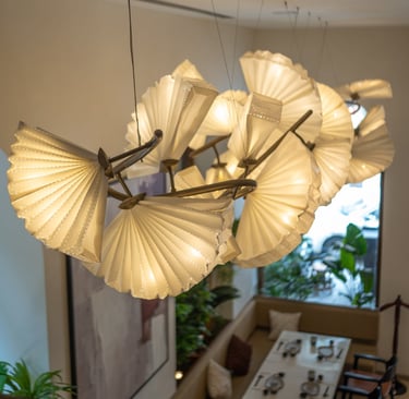 Where and how you place the installation makes all the difference. Position it where it’s visible from multiple vantage points—ideally where it draws the eye upon entry and continues to engage guests throughout their meal. Complement it with intentional lighting to enhance form, texture, and depth. The right lighting transforms the piece into a living part of the space, changing in mood from day to night.