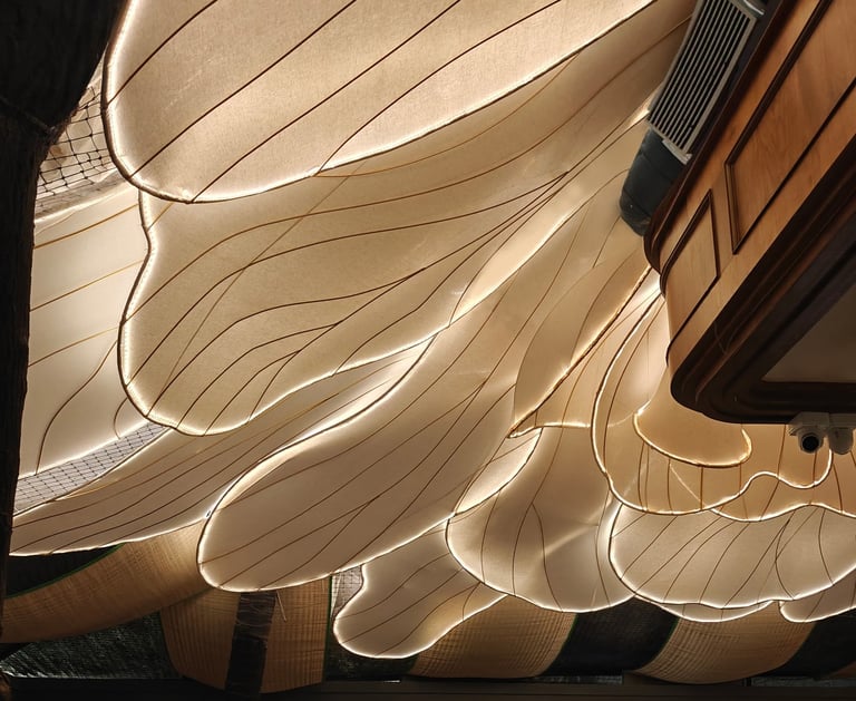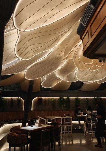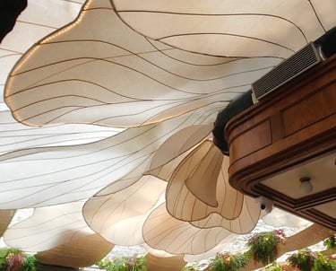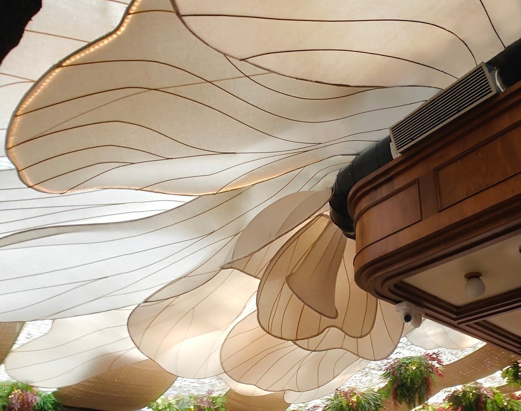 The design solution Floraison—a sculptural bloom handcrafted from metal rods & soft cotton fabric, floating above diners, glowing softly, and creating an enchanting, Instagram-worthy ambiance.