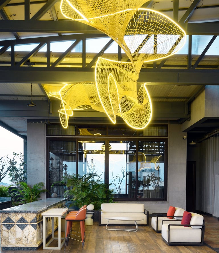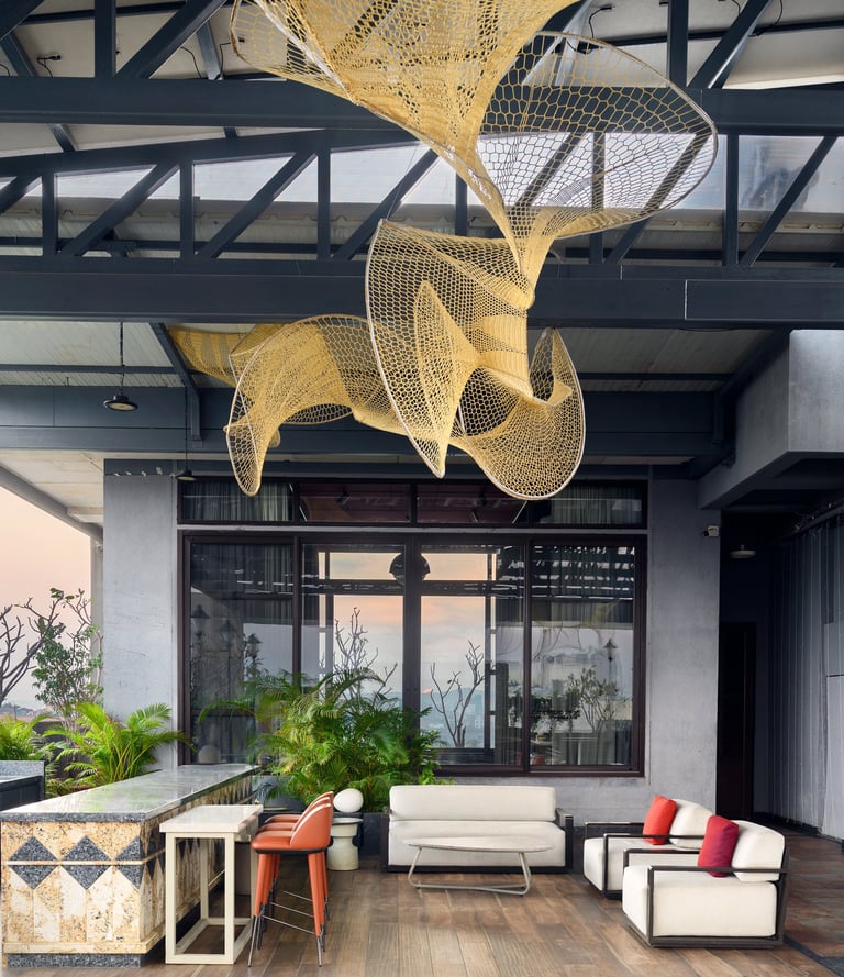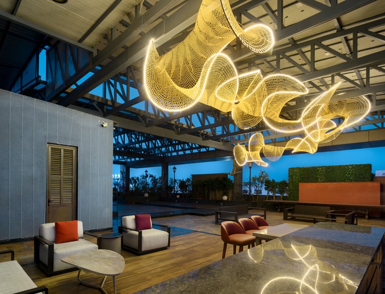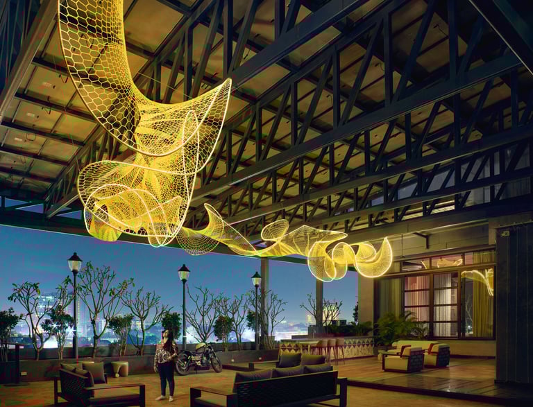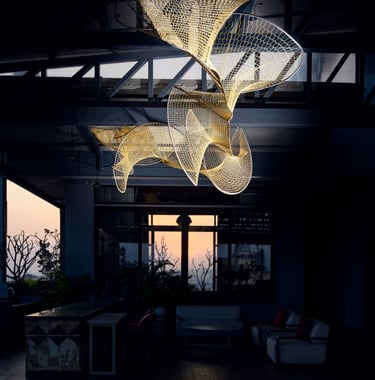 Samīrasa is a poetic celebration of the ethereal essence of wind, captured through a crocheted art installation. Crafted from polysilk threads, the installation features an intricate dance of voluptuous curves and flowing patterns, echoing the gentle, unpredictable rhythm of a breeze.