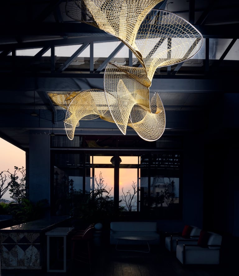 Material : M.S. Metal Frames PVD coated, polysilk threads and LED lights