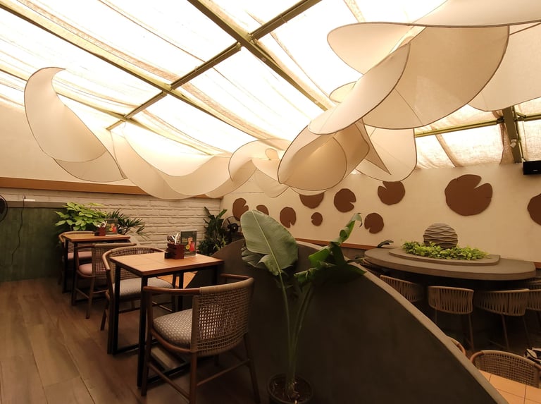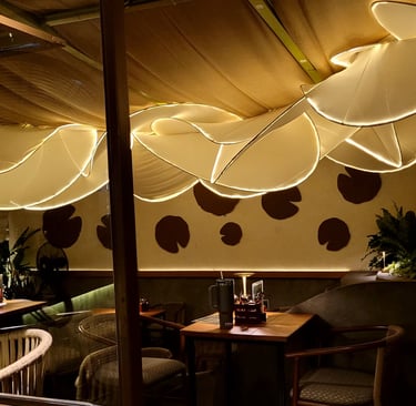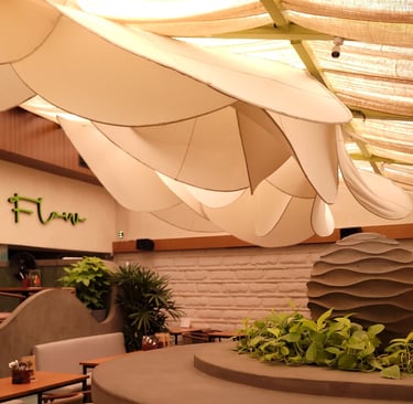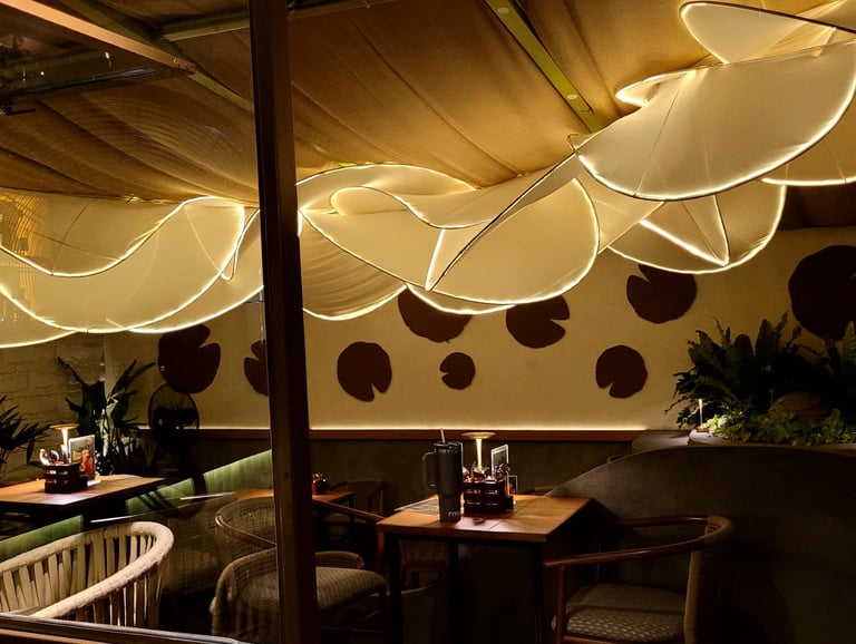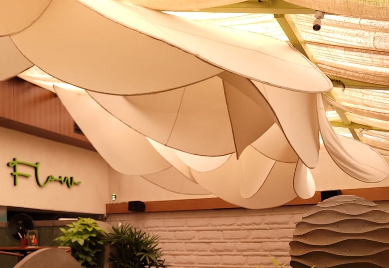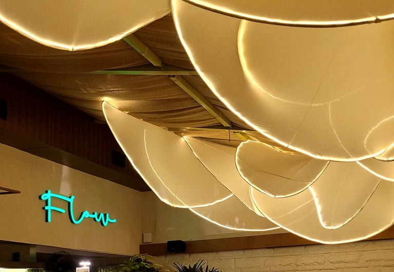 Tarang is a luminous sculptural installation that captures the essence of movement and fluidity. Crafted from elegantly curved metal frames, draped in translucent white fabric, and illuminated by embedded LED strip lights, it evokes the soft undulations of wind and water. The interplay of light and shadow enhances its ethereal presence, creating a dynamic yet soothing atmosphere. Suspended in space, its voluptuous curvilinear form appears weightless, shifting perspectives as one moves around it. This installation transforms its surroundings into a dreamlike realm, where light dances across its fabric, blurring the boundaries between materiality and illusion.