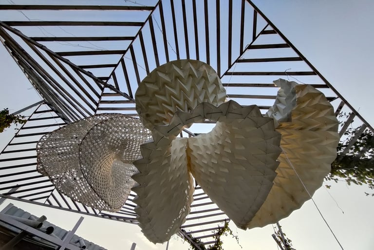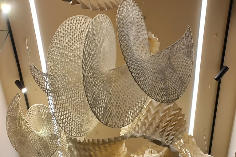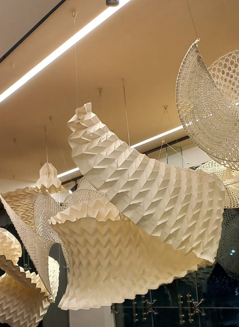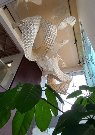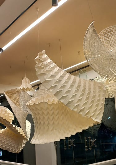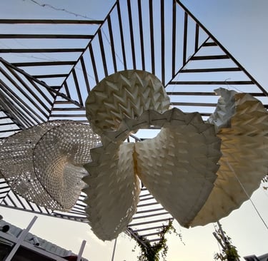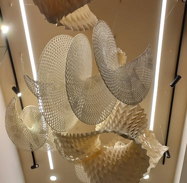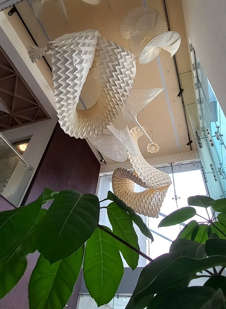 In the Entrance Foyer of the Bravo 1 Office at Bengaluru Airport, Origami and Crochet converge to tell a story of flight and flow. The origami elements capture the essence of aerodynamics and exploration, with meticulously folded birds, planes, and abstract forms suspended mid-air, symbolizing precision and innovation in aviation.