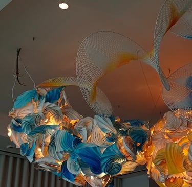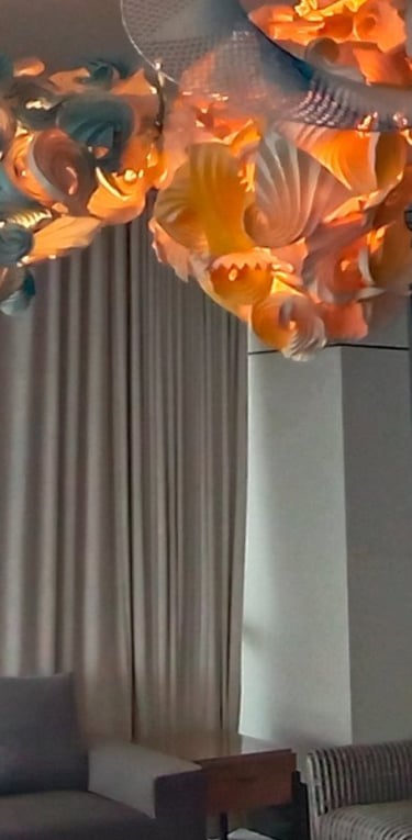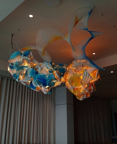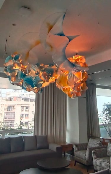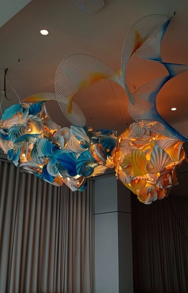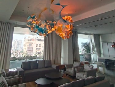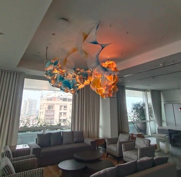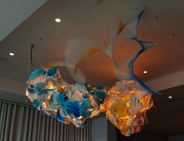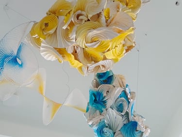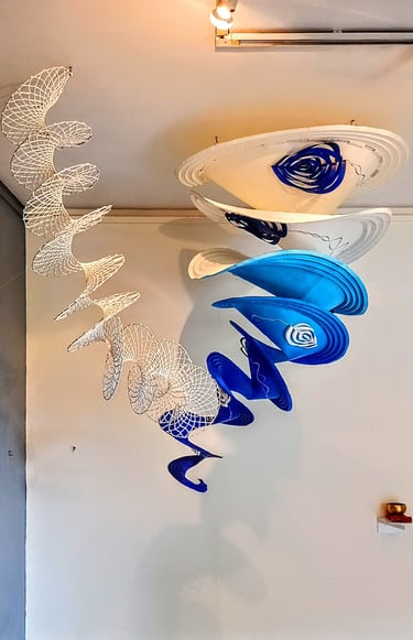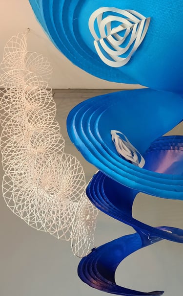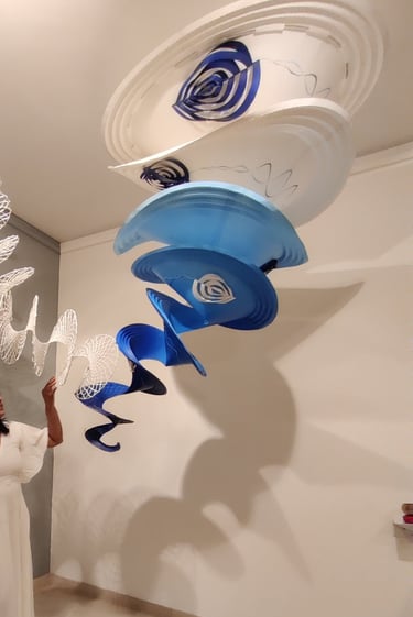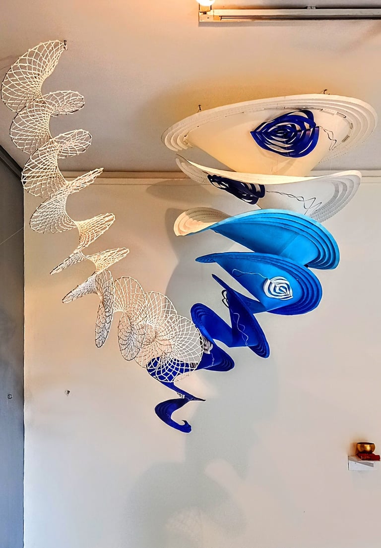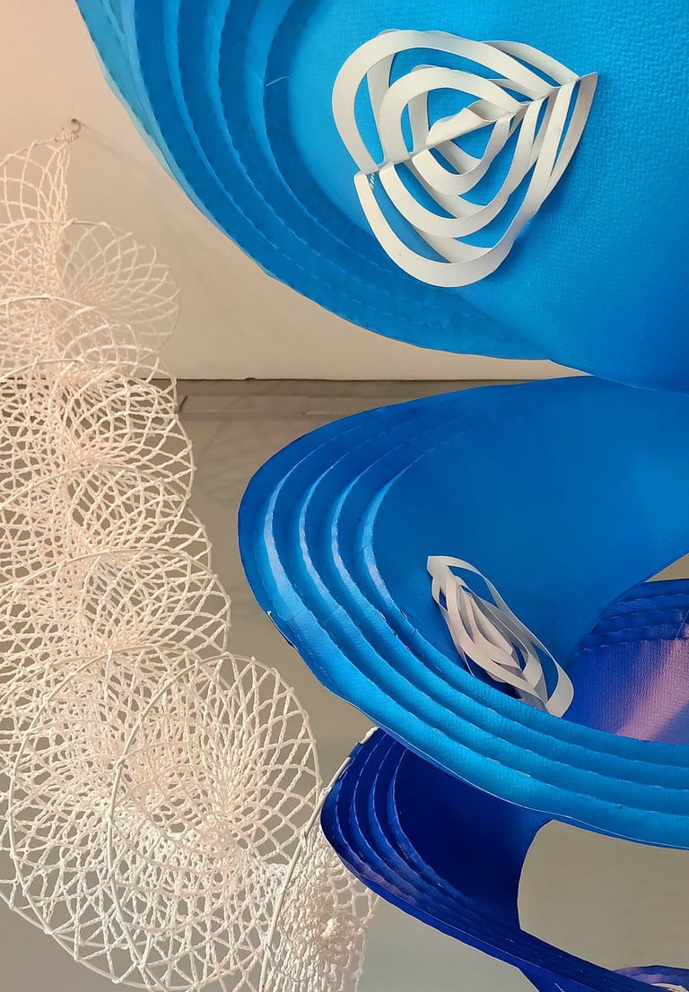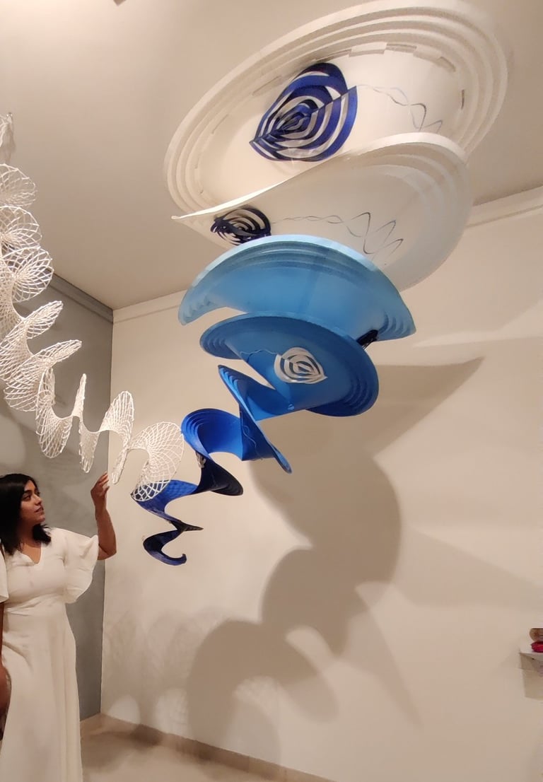 Antara has embraced the Buddhist symbol 'Unalome', which represents the journey of individual transcendence into universal consciousness. She sculpturally represents this symbol through a hand-folded and hand-painted kalmon chain origami spiral, infused with the spiritually significant color blue. This primary form is layered with lotuses, symbolizing steps towards reaching Buddha-hood, and meticulously detailed drawings reflecting the sound frequencies of the Buddhist mantra “Nam Myo Ho Ren Ge Kyo,” embodying the six steps of devotion to the mystic law of the Lotus Sutra. Together, these artists intertwine mantras from two different religious traditions, transcending religion to speak about self-growth and evolution.