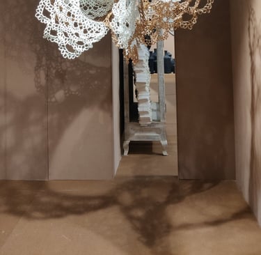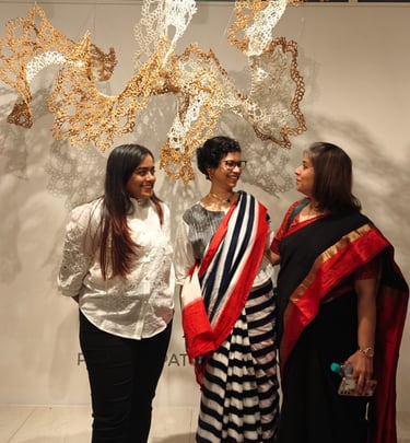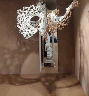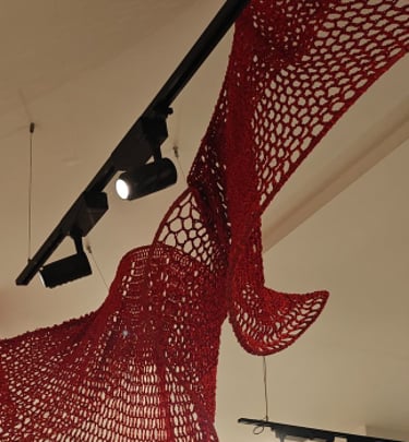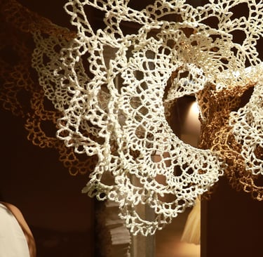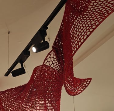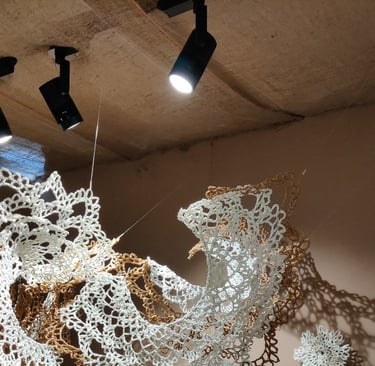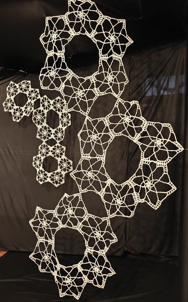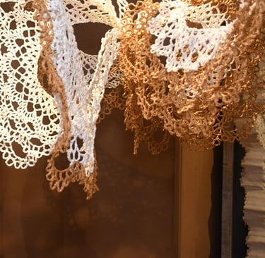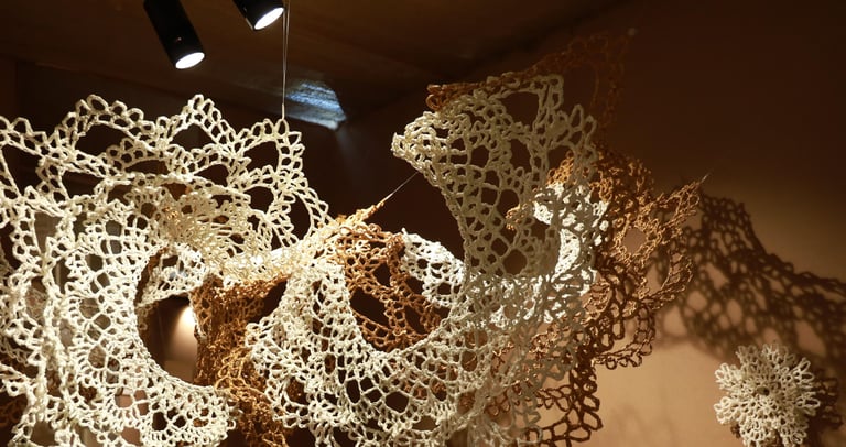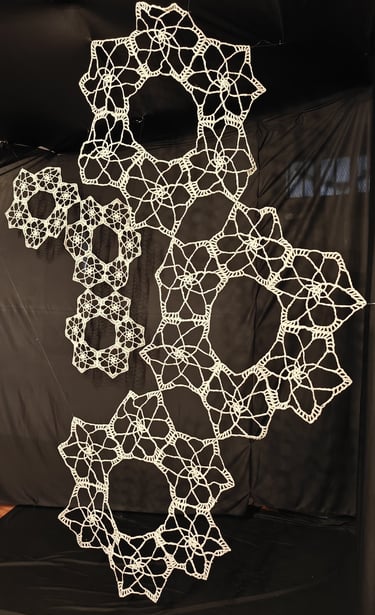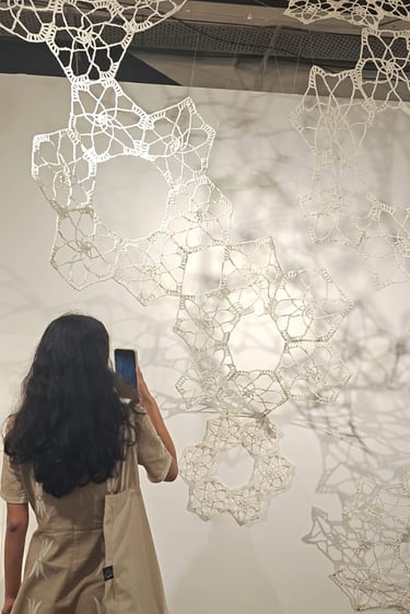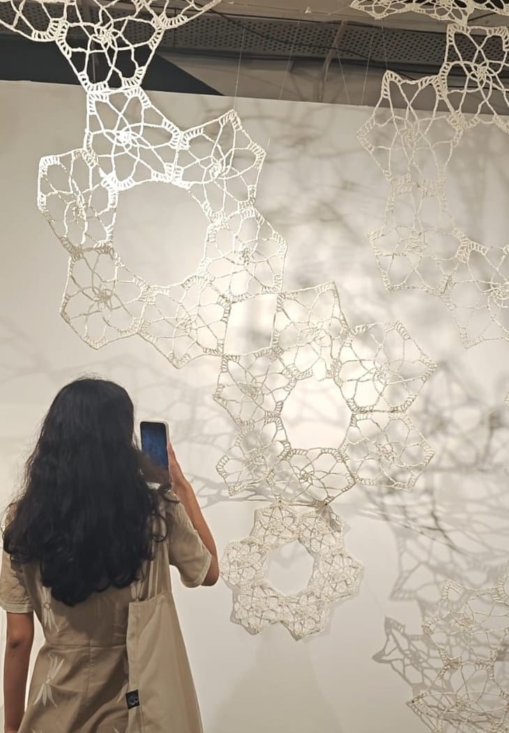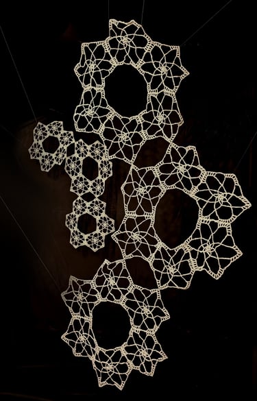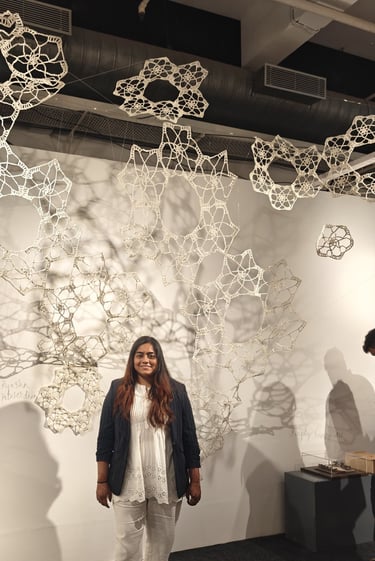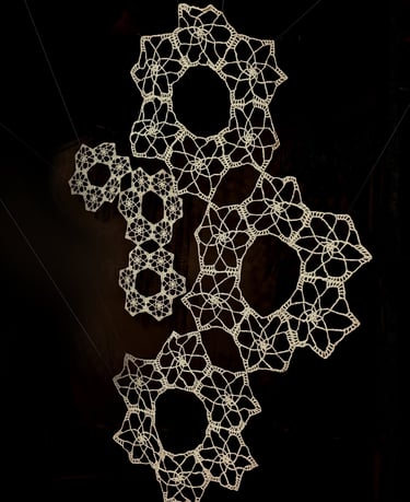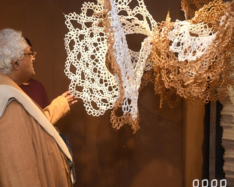 In Taramandal / तारामंडल, each hand-crocheted mandala unfurls like a microcosmic constellation, where every knot serves as a star in its own right. The intricate web of knots within each mandala forms galaxies—celestial gatherings of these stars, suspended in harmony and interconnection. The gaps, the breathing spaces between the mandalas, evoke the profound silence and expansiveness of the universe itself, embodying the cosmic unknown that lies between galaxies.Taramandal is a reminder of humanity’s place within this vastness—how each of us, like a knot, is bound to others in invisible threads, forming galaxies of communities and relationships. The installation invites viewers to experience a reflective journey, contemplating the beauty of connection and the humbling grandeur of the unknown. Like the stars that shine from unimaginable distances, Taramandal is a celebration of both the individual and the collective, anchored in the delicate balance of interstellar wonder.