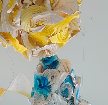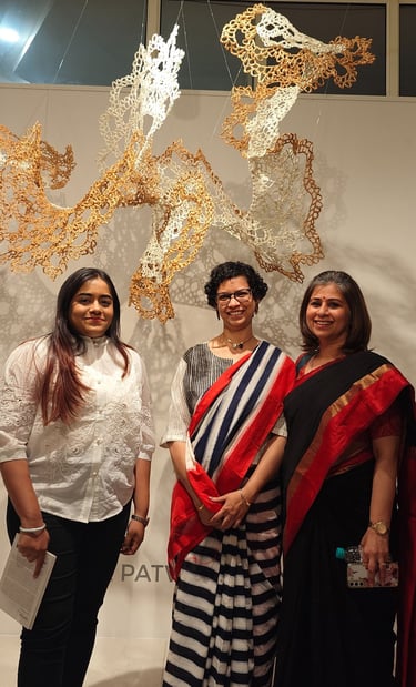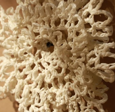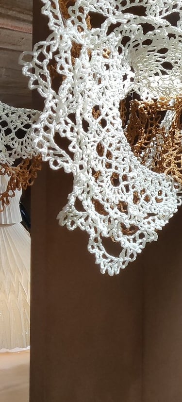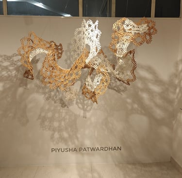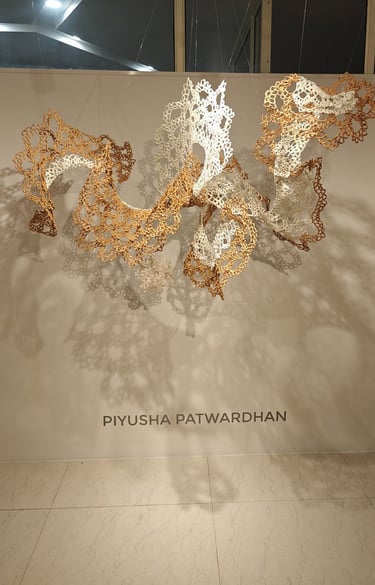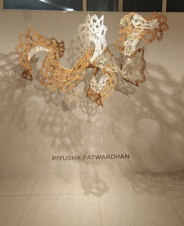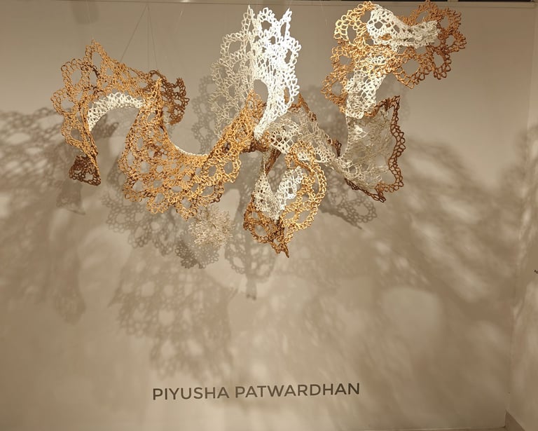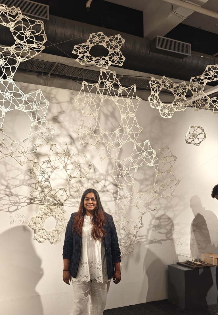 Piyusha is intrigued by the potential narrative these patterns might reveal about the birth of light within the sun. Piyusha illustrates this metaphor through her work, using paper thread to meticulously crochet a similar geometric design that unfolds in a wave-like pattern. Employing dual colors, white symbolizes the formation of light, while brown signifies light touching the terrestrial tapestry. Many such crocheted waves emanate from the गर्भ-स्त्रोत (origin) of the sun to imprint its essence on the earthly canvas.