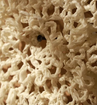 Piyusha has selected the Saraswati beej mantra—ॐ श्रीं सरस्वत्यै नमः—to crochet a spiral of the flower of life pattern in pristine white. Her work symbolizes a prayer rising like a tendril of a climbing plant reaching for the sun. For Piyusha, crocheting is akin to turning prayer beads, expressing her desire to dedicate her life to learning, imbibing, and growing.